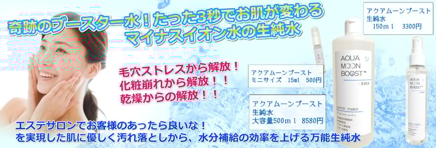 ニキビ・肌荒れ・毛穴ケアのスキンケア商品は乾燥肌・敏感肌・脂性肌対策で水が重要!トラブルの原因は乾燥と油だからです。肌質改善エステにも使用されるマイナスイオン水でお肌を蘇らせたら、ホームケアでも徹底した乾燥対策にご使用ください。肌再生の近道です